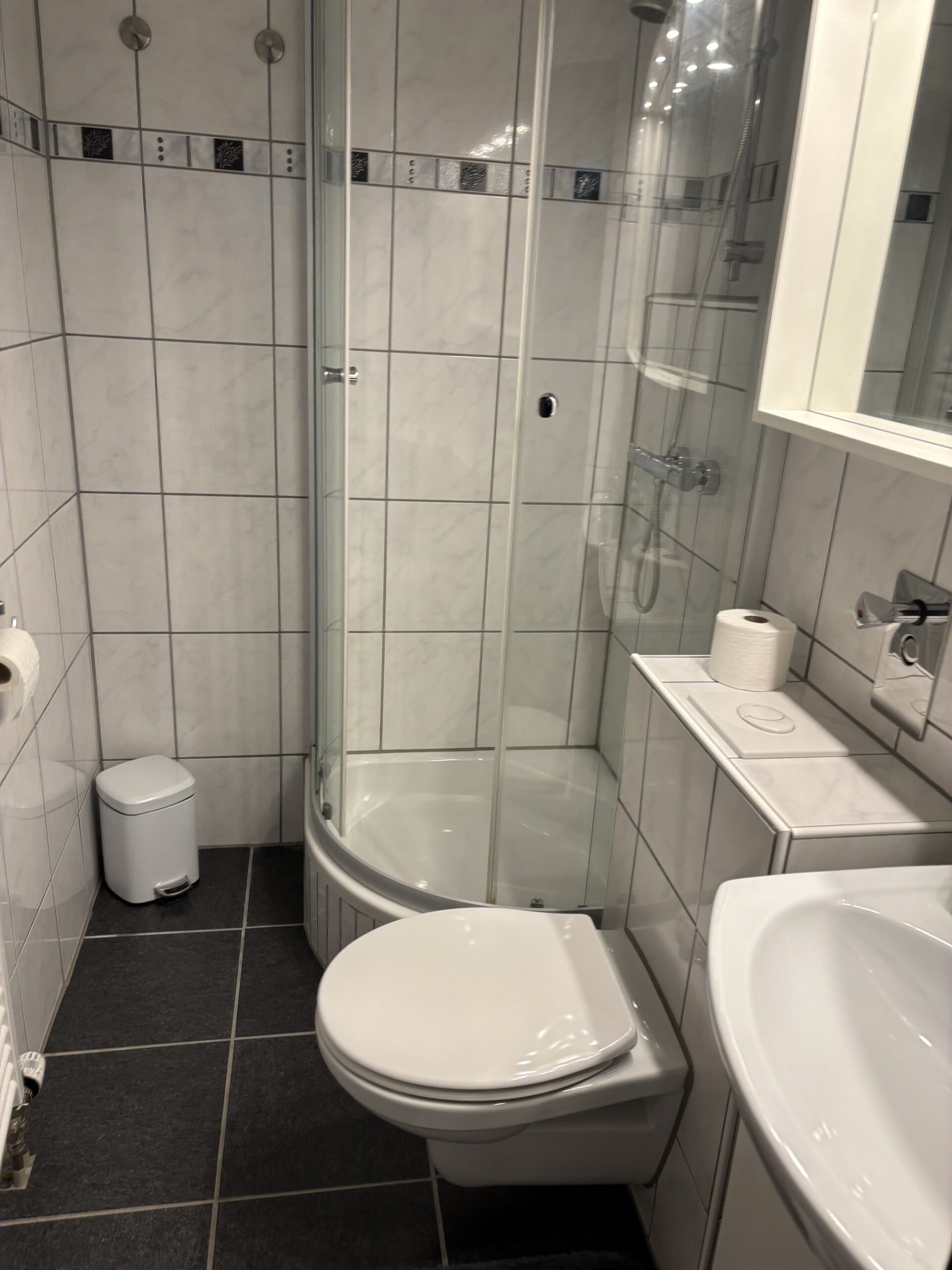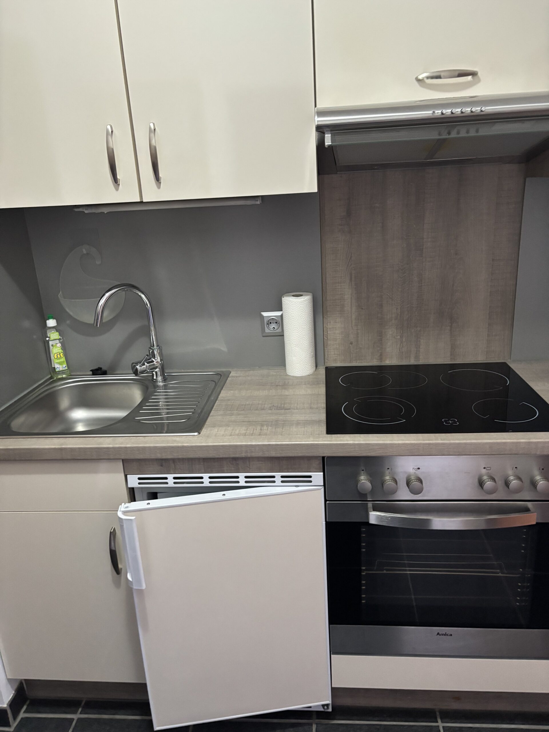 Das Haus hat ein Wohn / Schlafzimmer mit zwei Betten und einer Schlafcouch. Es gibt eine abgetrennte Küchenzeile und ein modernes Badezimmer.